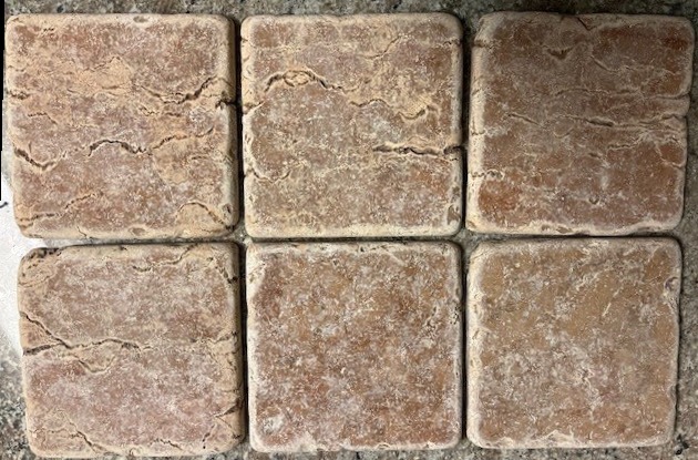 Golv och väggplattor av ofylld Travertin . Lätt rundade kanter. 12 m2 6000:- inkl moms för hela partiet